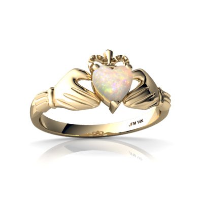 Celtic Claddagh rings have also been referred to as a faith rings. The heart, crown and hands in the design symbolize love, loyalty and friendship. To be given a Claddagh ring is a sign of a deep love for the receiver, a love which will last forever.This celtic claddagh ring features a 5mm heart-cut opal center stone. The total gem weight for the ring is 0.5 carats, set in solid 14k gold. The band is 3/8 of an inch at its widest point tapering down to 1/16 of an inch at the back, and is 3/16 of an inch high off the finger.